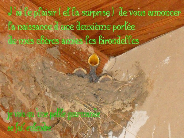 Une surprise hier m'attendait..de petits bruits , et voilà que je vois que mes chères hirondelles ont fait de nouveaux bébés , j'espère qu 'elles auront le temps de grandir avant de partir , cela me semble un peu tard , enfin, nous verrons je vous tiens au courant . une petite chipie me semble bien affamée..elles sont trois ...cette fois , je pense ?