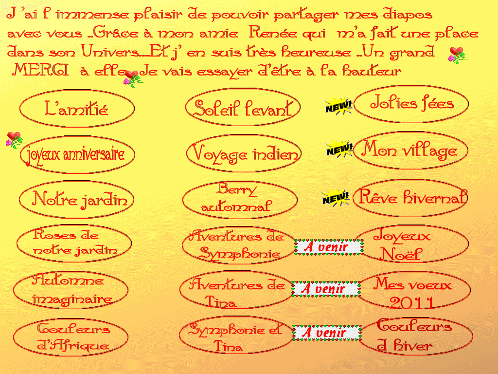 J'ai le très grand honneur et bonheur d'avoir mes premiers diapos chez mon amie Renée , je la remercie vraiment de tout coeur de m'avoir ouvert une rubrique pour pouvoir les partager avec vous ..Elle me fait vraiment plaisir et je suis fière d 'être " chez elle" ..je vais essayer de ne pas la décevoir et d être à la hauteur de sa confiance...rubrique "les diaporamas de mon amie guilaine "